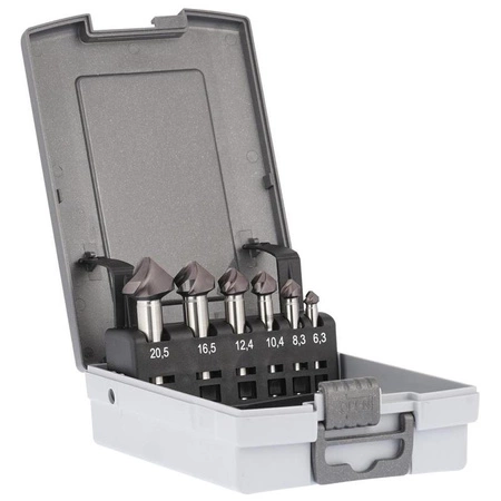 - Komplet pogłębiaczy Ø 6,3–25 mm HSS-Co TiAlN z chwytem cylindrycznym. Trwała kaseta i zoptymalizowana geometria ostrzy dla płynnej pracy.