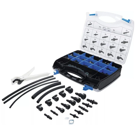 - Zestaw rur i złączek z tworzywa sztucznego 95 szt. Do naprawy przewodów paliwowych i próżniowych, zawiera rury, złączki i węże gumowe.