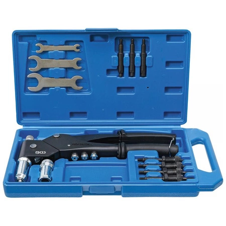 - Zestaw szczypiec do nitów, nitonakrętek i nitowkrętów, BGS 438 z obrotową główką 360° ułatwia pracę w trudno dostępnych miejscach. W zestawie nitownica, trzpienie i klucze do różnych typów nitów i nitonakrętek.