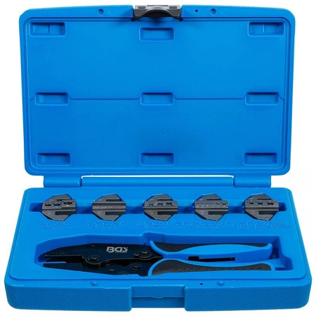 - Zestaw szczypiec zaciskowych z 5 parami wymiennych szczęk pozwala na zaciskanie różnych końcówek kablowych. Automatyczna grzechotka, regulowana blokada i solidna walizka gwarantują wygodę użytkowania i długotrwałość.