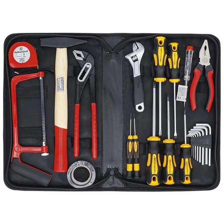 - Zestaw narzędzi w walizce, zawierający 23 elementy, idealny do precyzyjnych prac mechanicznych. W skład wchodzą m.in. piłka ręczna, młotek, wkrętaki, klucz nastawny, taśma miernicza, klucze trzpieniowe oraz kombinerki.