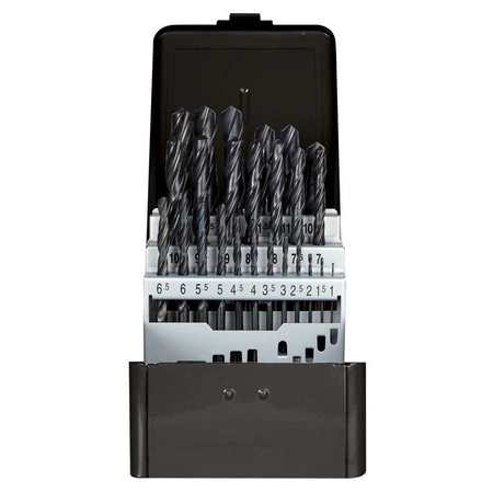 - Zestaw 25 wierteł HSS Ø 1–13 mm co 0,5 mm. Kąt wierzchołkowy 118° zapewnia wydajne wiercenie w metalu, drewnie i tworzywach. Metalowa kaseta chroni narzędzia.