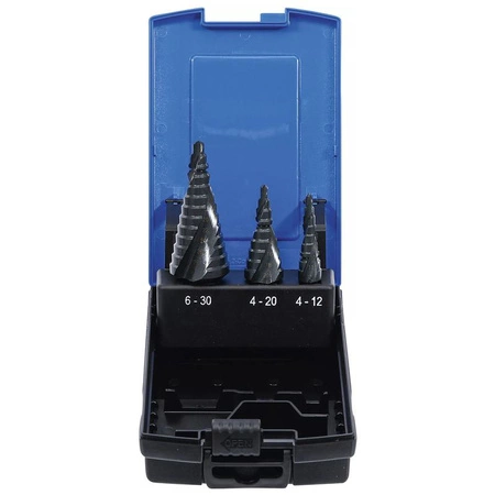 - Zestaw wierteł stopniowych Ø 4-30 mm, 3 szt. Wykonane ze stali HSS 6542, powlekane azotkiem dla większej trwałości.