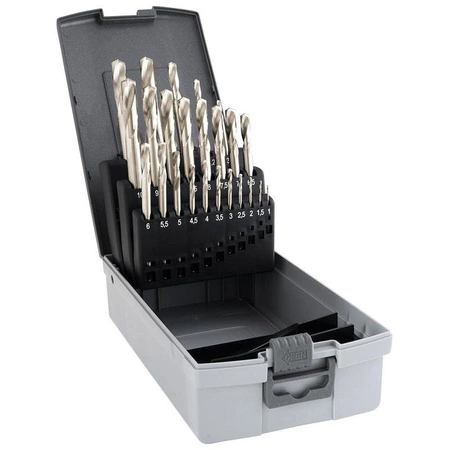 - Zestaw precyzyjnych wierteł z krótkim rowkiem wiórowym, zakres Ø 1–10,5 mm. Do obróbki stali i metali kolorowych.