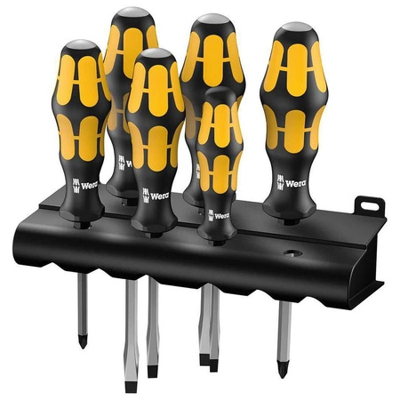 - Zestaw 6 wkrętaków płaskich i krzyżakowych PH do podkręcania, podbijania oraz kucia marki Wera w wygodnym uchwycie ściennym. Końcówka Blackpoint oraz specjalny proces hartowania zapewniają długi okres użytkowania.