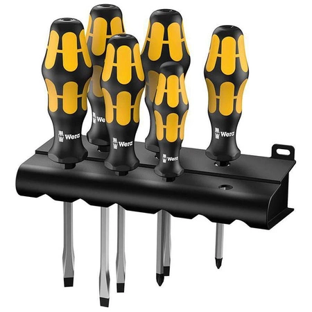 - Zestaw 6 wkrętaków płaskich i płasko-krzyżakowych PH do podkręcania, podbijania oraz kucia marki Wera w wygodnym uchwycie ściennym.