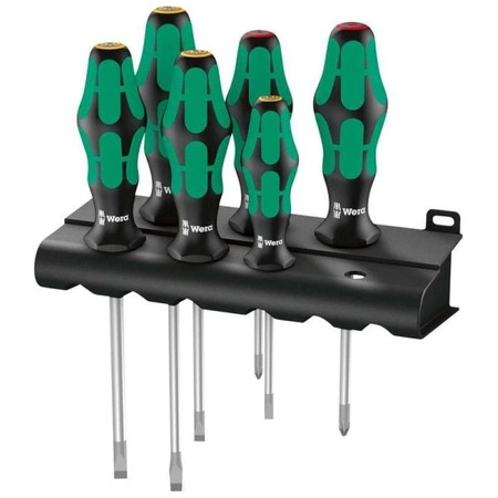 - Zestaw 6 wkrętaków płaskich i płasko-krzyżakowych PH marki Wera w wygodnym uchwycie ściennym. Końcówka Lasertip zapewnia pewne osadzenie narzędzia we wkręcie.