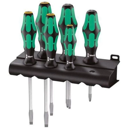 - Zestaw 6 wkrętaków płaskich i płasko-krzyżakowych PH marki Wera w wygodnym uchwycie ściennym. Końcówka Lasertip zapewnia pewne osadzenie narzędzia we wkręcie.
