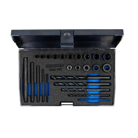 Gedore 8552-025 to kompletny zestaw do usuwania urwanych śrub i nakrętek gwintowanych w zakresie od M5 do M16. Praktyczna konfiguracja 25 elementów pozwala na szybką i bezpieczną pracę w warsztacie lub w terenie, bez ryzyka uszkodzenia gwintu w obróbce.
