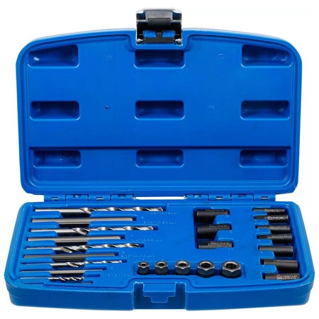 - Zestaw wykrętaków HSS 25 szt., BGS 8462 – umożliwia profesjonalne wykręcanie złamanych śrub i kołków, zawiera wiertła, tuleje prowadzące i adaptery.