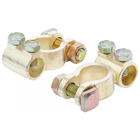 - Zestaw zacisków akumulatora zawiera okrągłe uchwyty kablowe z 2 śrubami zaciskowymi. W zestawie znajduje się 1 zacisk bieguna dodatniego oraz 1 zacisk bieguna ujemnego, zapewniający solidne połączenie.