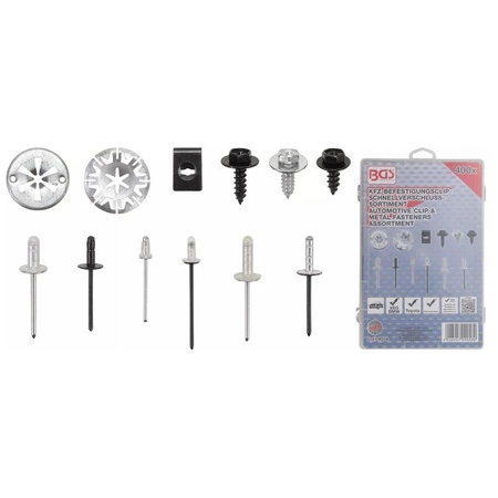 - Zestaw zatrzasków do samochodów dla Audi, VW, Toyota, Mercedes-Benz, BMW 400 szt., BGS 9058 – zawiera szybkozłączki, śruby, metalowe nity uszczelniające, pasujące do Audi, VW, BMW, Toyota, Mercedes-Benz do różnych mocowań i elementów.