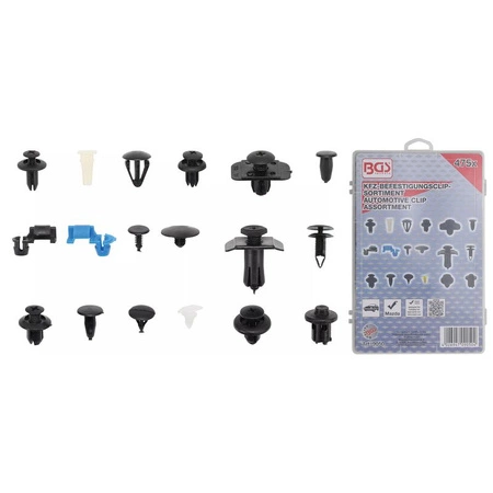 - Zestaw zatrzasków do samochodów dla Mazda 475 szt., BGS 9050 – zawiera zatrzaski rozporowe, łączące, do izolacji maski, zderzaków, zamków drzwi, tapicerki wnętrza, uszczelek, błotników i listew dekoracyjnych, do modeli Mazda.