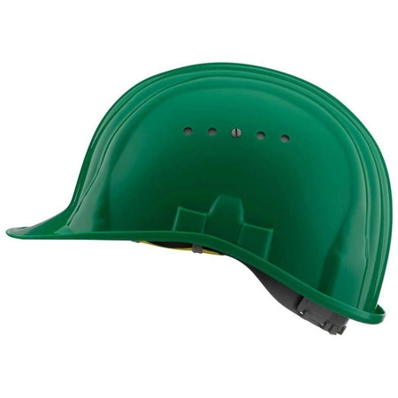 - Zielony kask ochronny z wentylacją, skórzaną opaską i uchwytami. Obniżony tył i rynienka skutecznie chronią przed wodą.